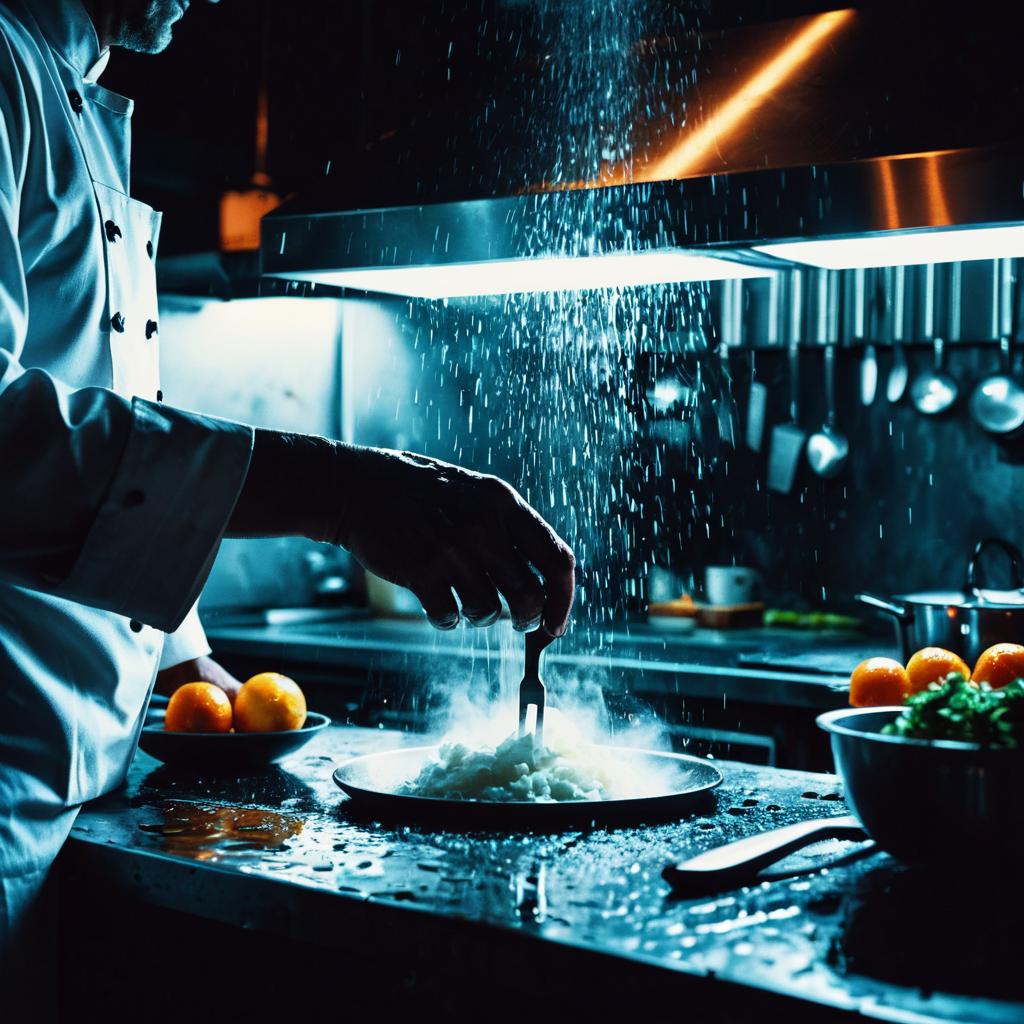 Close-up of a chef's hand sprinkling flour over a stainless steel countertop in a dimly lit professional restaurant kitchen. Steam and water droplets are visible around the hand, creating a dramatic and cinematic atmosphere with neon and warm lighting illuminating the scene.