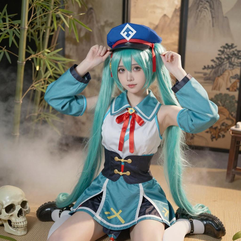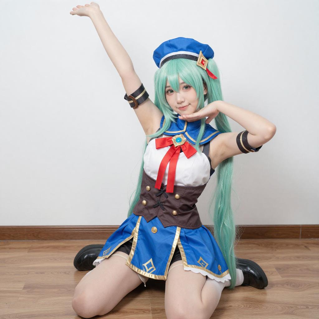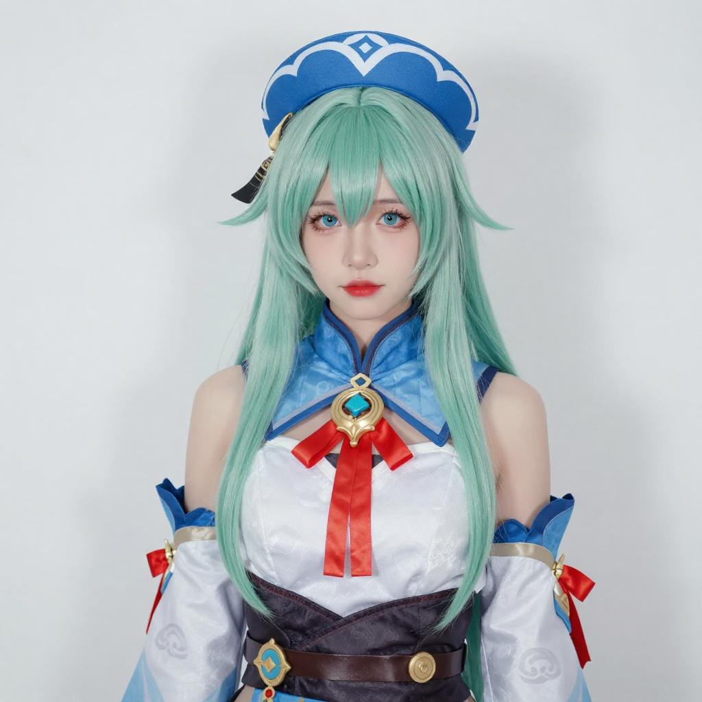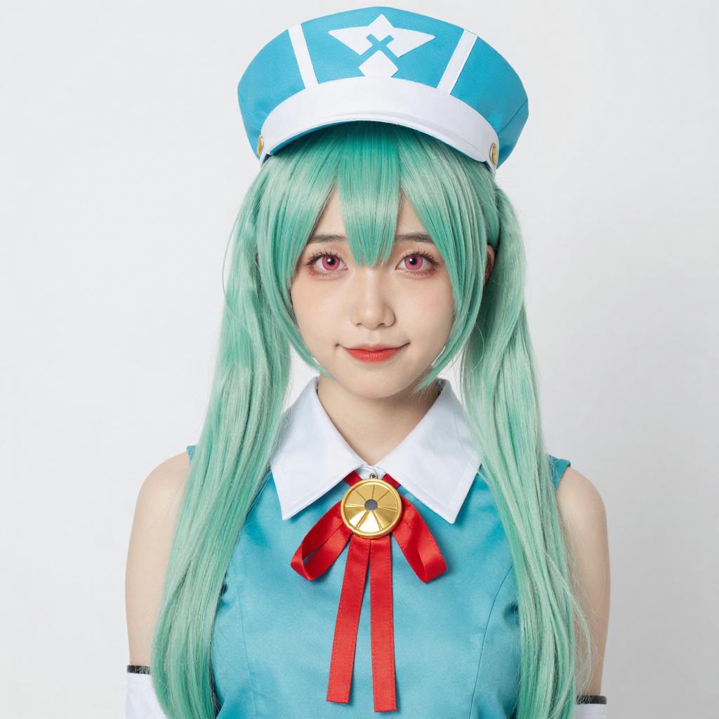 Photograph of a young woman cosplaying with long, mint-green hair, wearing a blue and white hat with white symbols, and a teal, sleeveless outfit with a white collar and red ribbon. She has fair skin, pinkish-red eyes, and a small, red-lipped smile. A gold pendant with a red ribbon hangs around her neck. The background is plain white.