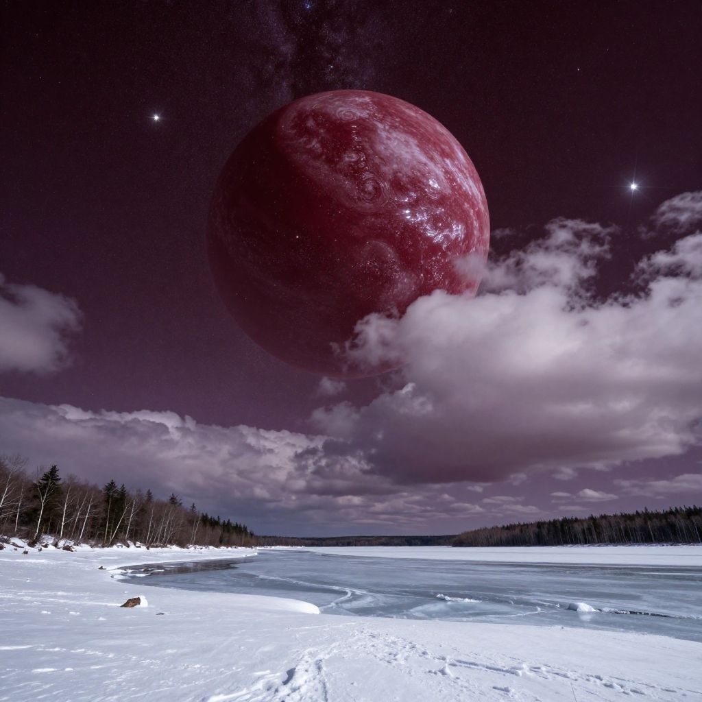 A surreal digital artwork depicts a snowy landscape with a frozen lake in the foreground and a dense forest of bare trees on the left. The sky is dark purple with two bright stars and a large, red, textured moon partially obscured by white clouds. The moon's surface has a rough, cratered appearance. The snow on the ground is bright white, contrasting with the dark and moody sky. The overall scene combines elements of realism and fantasy, creating a dreamlike atmosphere.