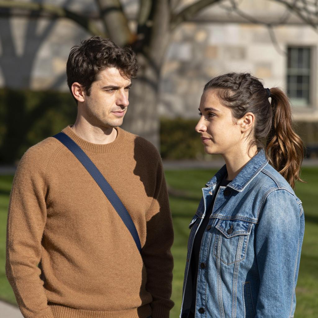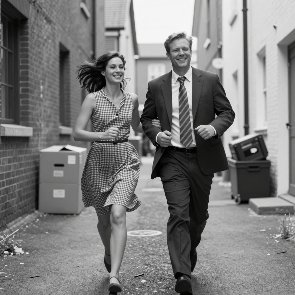 Black-and-white photograph of two people running in a park. Man in dark suit, short hair, smiling. Woman in checkered blazer, black beanie, open mouth, laughing. Ornate metal fence, trees, and benches in background. Both mid-motion, foreground.