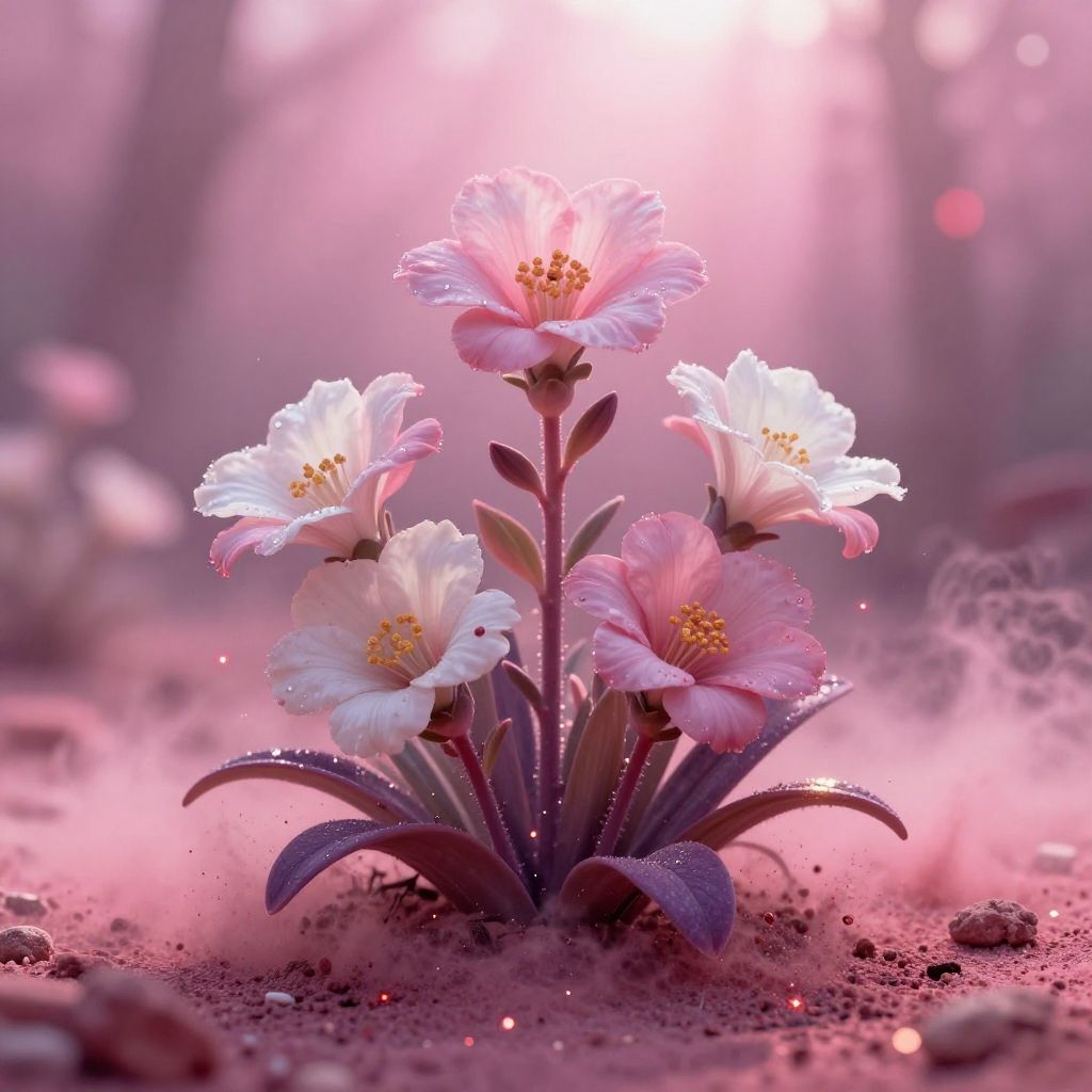 There is a strange plants and flower grow in the Venus soil, pink, white, purple environment, bloom, flowers bloom, golden particles, red spark, surrounding by pink dust, sun ray, pink atmosphere, realistic, ultra-detailed, 8k, masterpiece, fantasy, Flora