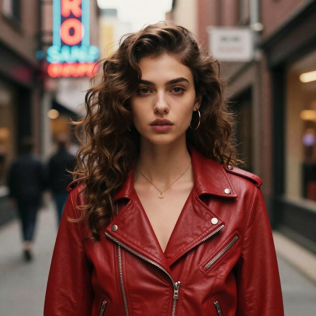 Wavy Blowout hairstyle on female model, wearing red leather jacket, in downtown alley, captured in fashion editorial style with neon signage light.