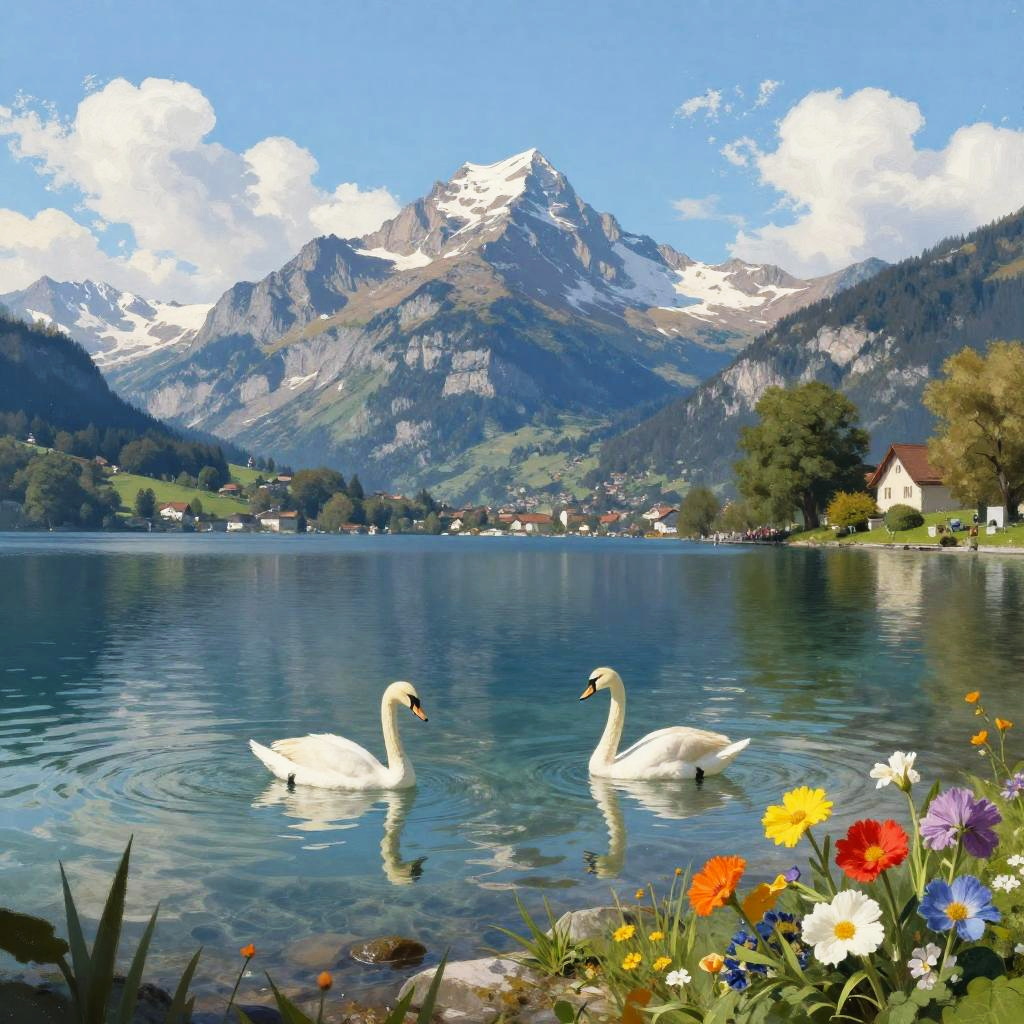 Lucerne lakeside view with Mount Pilatus in the background, crystal clear water with swans swimming, colorful flowers in the foreground, fluffy clouds in a bright blue sky, peaceful and scenic atmosphere, realistic digital painting