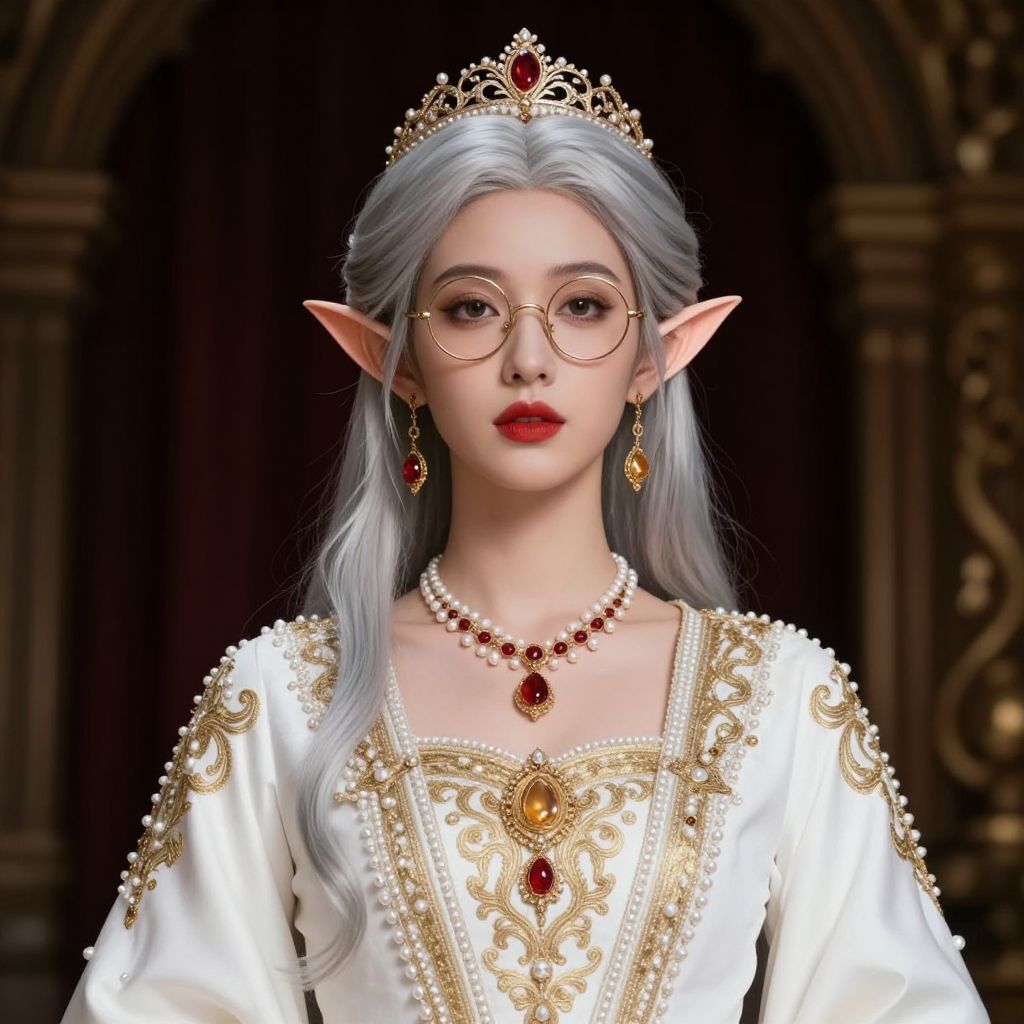 Female elf with long blonde hair and a crown on her head. She is wearing a gold outfit with a necklace and earrings.