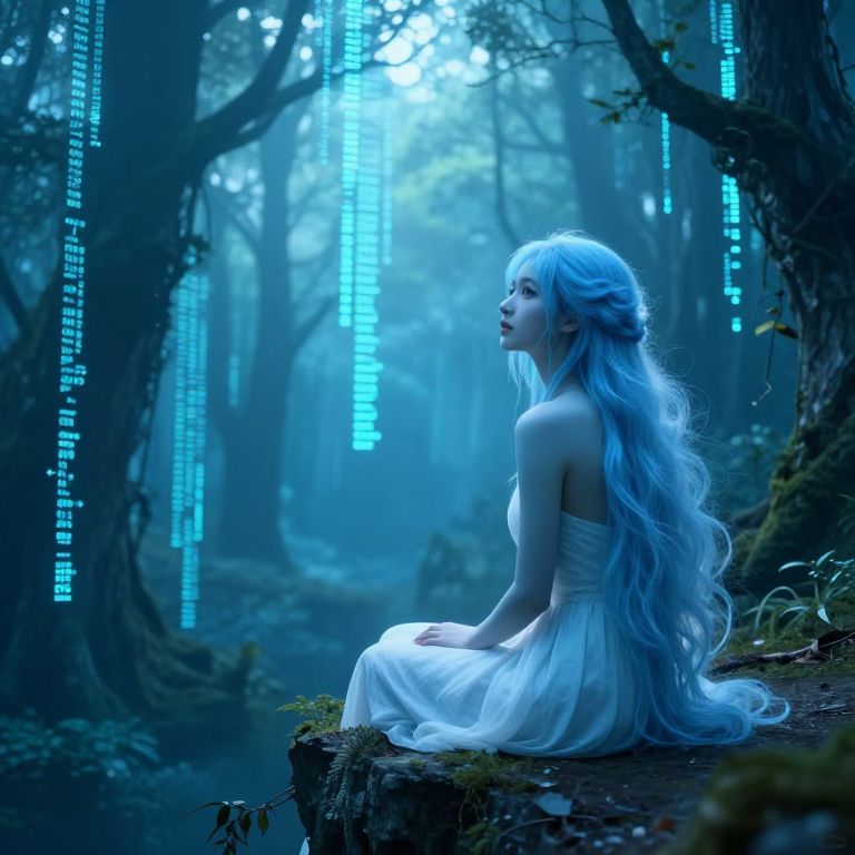 AI actress prompt: A serene AI actress with soft blue skin and ethereal hair, sitting on a cliff overlooking a digital forest where trees display flowing code, dreamy atmosphere, cinematic composition, ultra-realistic, Flux style, fantasy-meets-technology.