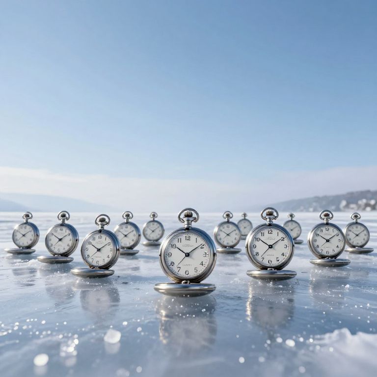 Rows of metallic pocket watches stand frozen in a reflective, icy expanse, their hands halted at various times, mirroring the serene yet surreal landscape beneath a clear, expansive sky.