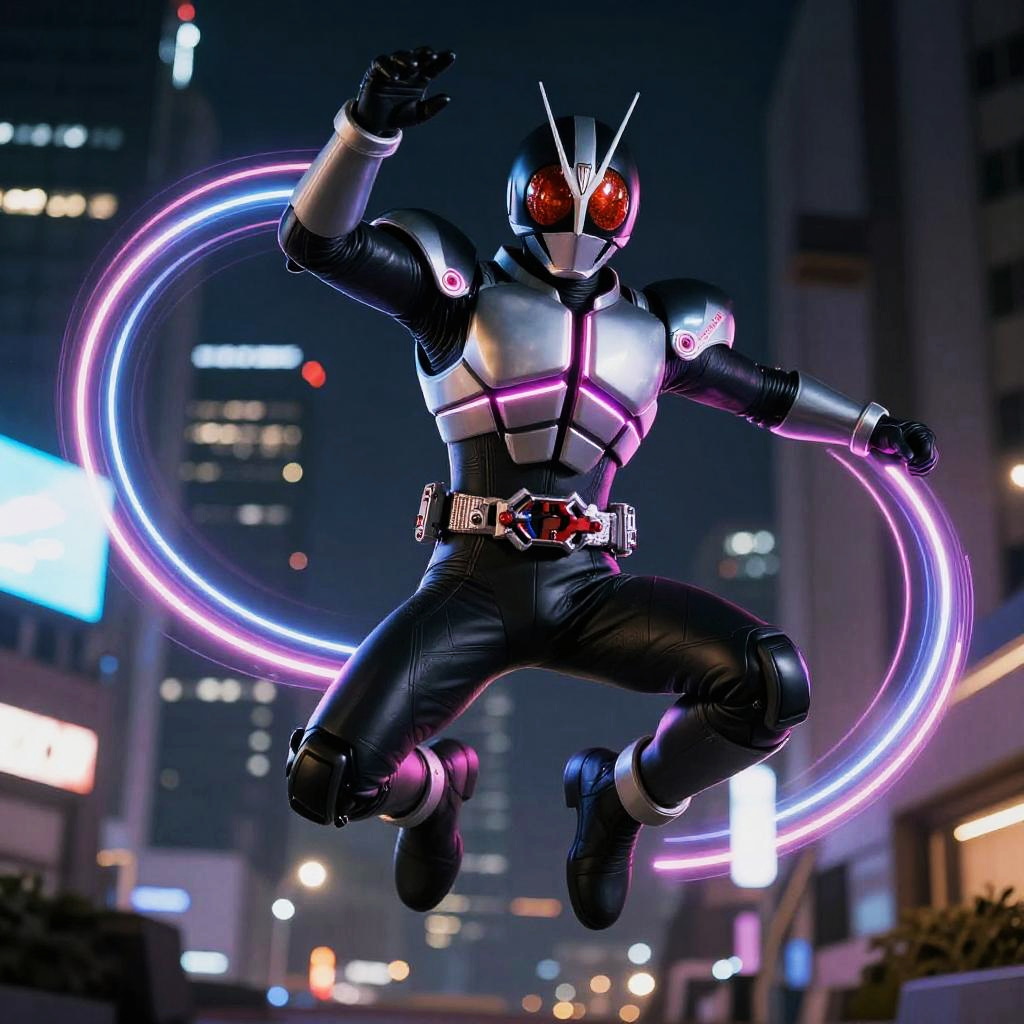 Kamen Rider pose, dynamic action stance with futuristic armor, glowing eyes, dramatic lighting, smoky background, high detail, cinematic look, comic book style