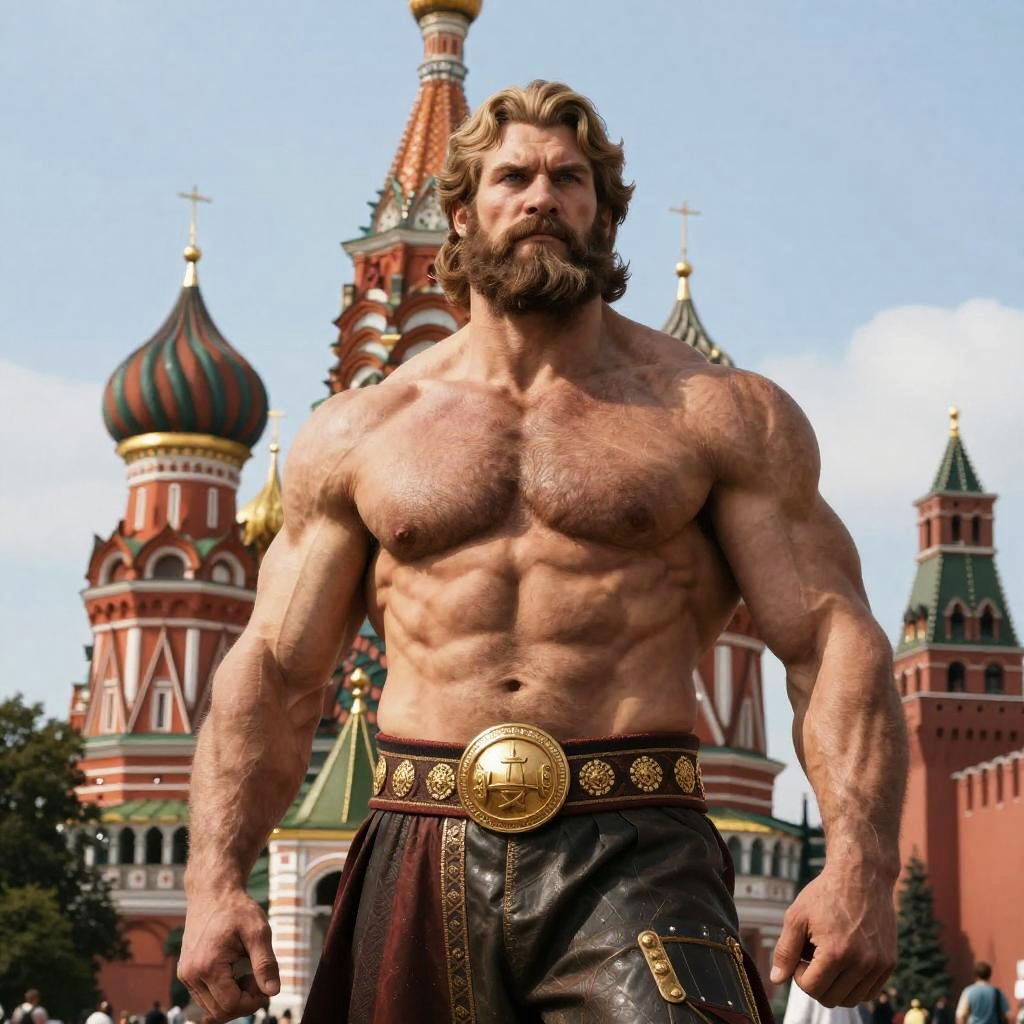 A photorealistic portrait of Russia personified as a mighty czar with Red Square with Kremlin displayed behind him. He appears strong, muscular, and tall, captured with Fujifilm GFX 100S, F2.8, ISO160, 56mm. The lighting is volumetric, highlighting insane details to create a powerful, imposing look.