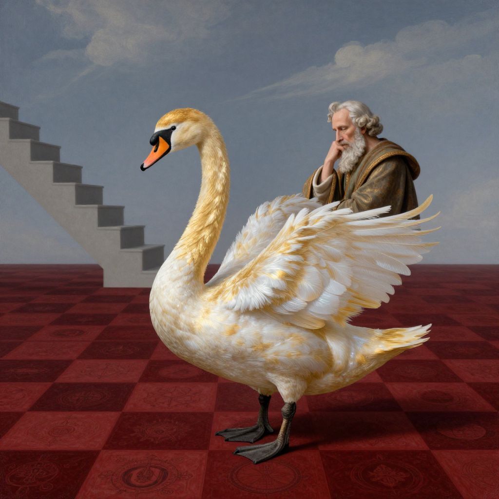 In the captivating realm of surrealistic art, envision an alluring scene where a majestic swan, its feathers gleaming with golden and silver hues, elegantly traverses a fantastical landscape. The checkerboard ground below is composed of deep crimson squares, each holding miniature narratives echoing ancient legends. As the swan nears an awe-inspiring staircase ascending into a boundless sky, it gradually unveils the visage of a contemplative philosopher within its plumage. This extraordinary depiction should evoke a sense of mystery and introspection, inspiring both wonder and fascination as viewers delve into the enigma at the core of this otherworldly domain.