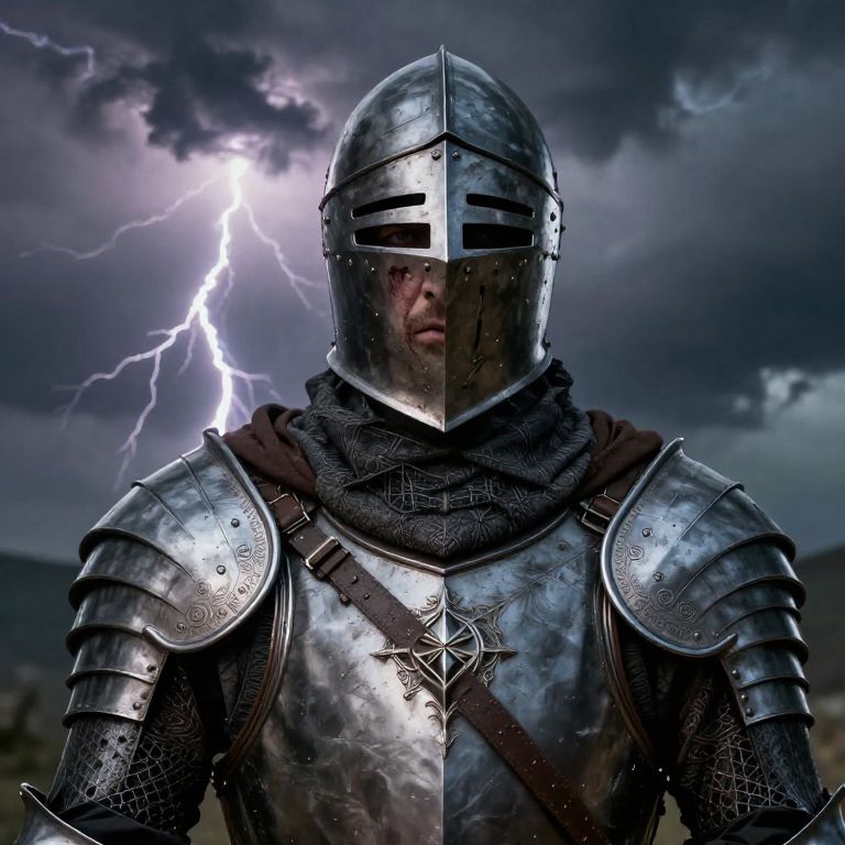 Photograph-style digital image of a medieval knight in shiny, dented silver armor with a lightning bolt in the stormy sky.