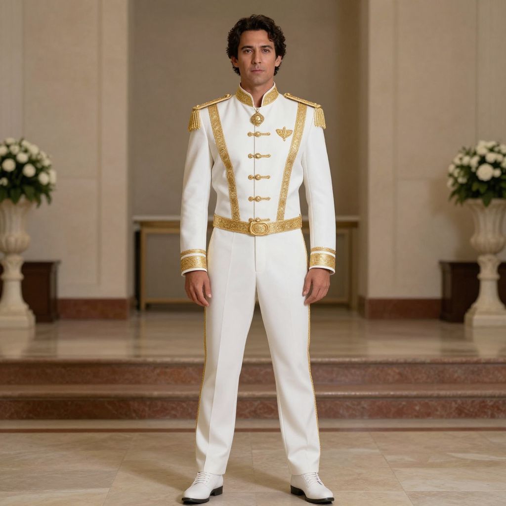 Mayor Augustus Maywho Costume, man in a white and gold outfit standing in a hall