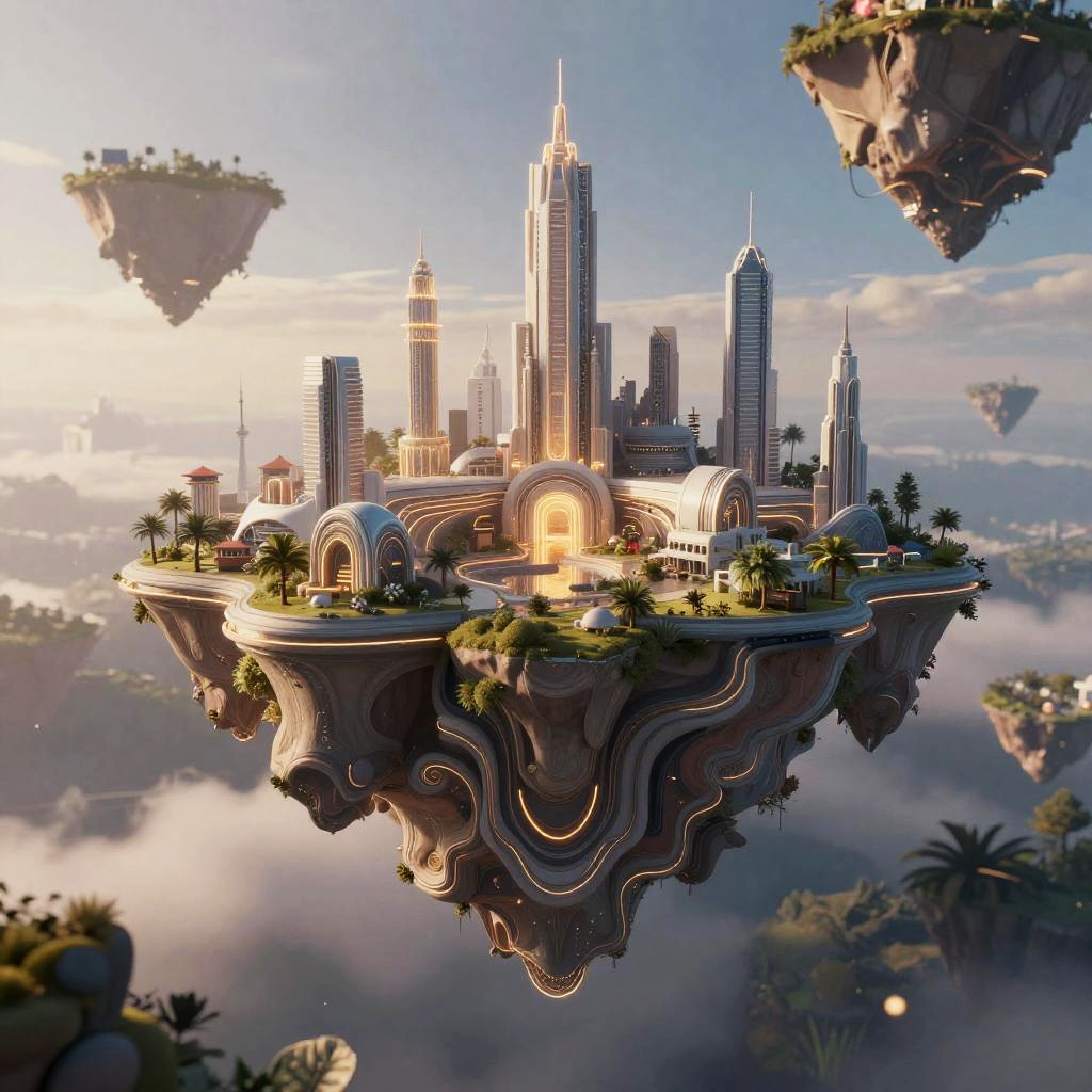 Photorealistic CGI of a futuristic floating city with towering skyscrapers, lush greenery, and suspended islands against a cloudy sky.