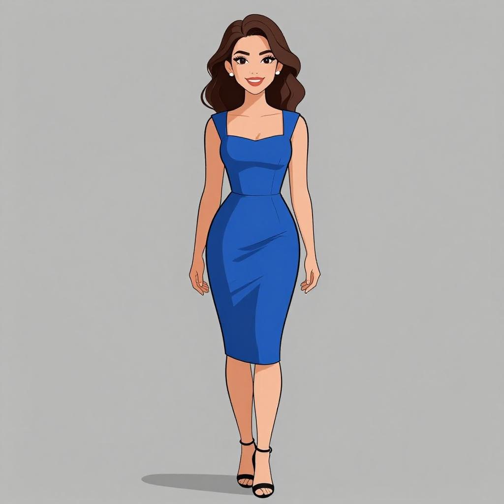 Woman with pretty face and pretty hair. smiling Woman, elegant, royal blue bodycon midi dress, square neckline, sleeveless, contoured seams, knee-length, black open-toe ankle strap heels. --sref 1467