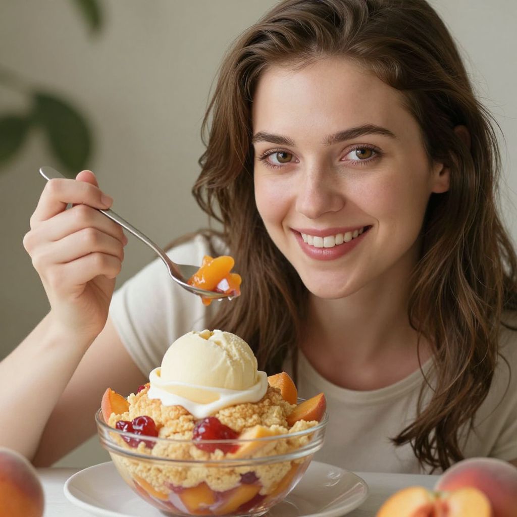Photograph of a smiling young woman with long brown hair, white top, eating a fruit parfait with whipped cream, holding spoon, two peaches on