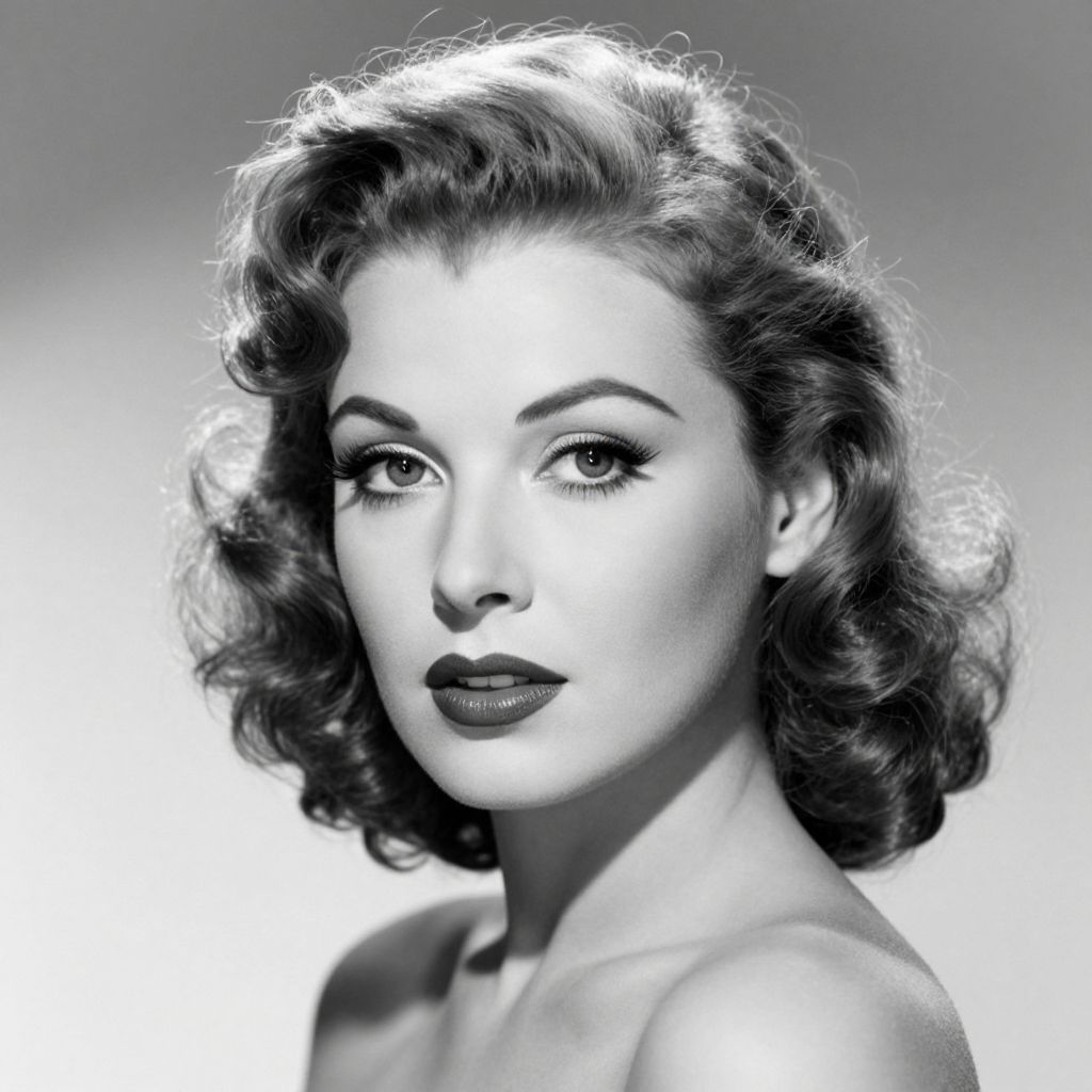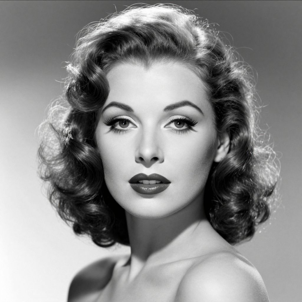 A striking black-and-white digital portrait featuring a woman with elegant, voluminous curls, rendered in a highly detailed, realistic style reminiscent of classic Hollywood glamour, showcasing dramatic lighting and a vintage aesthetic.