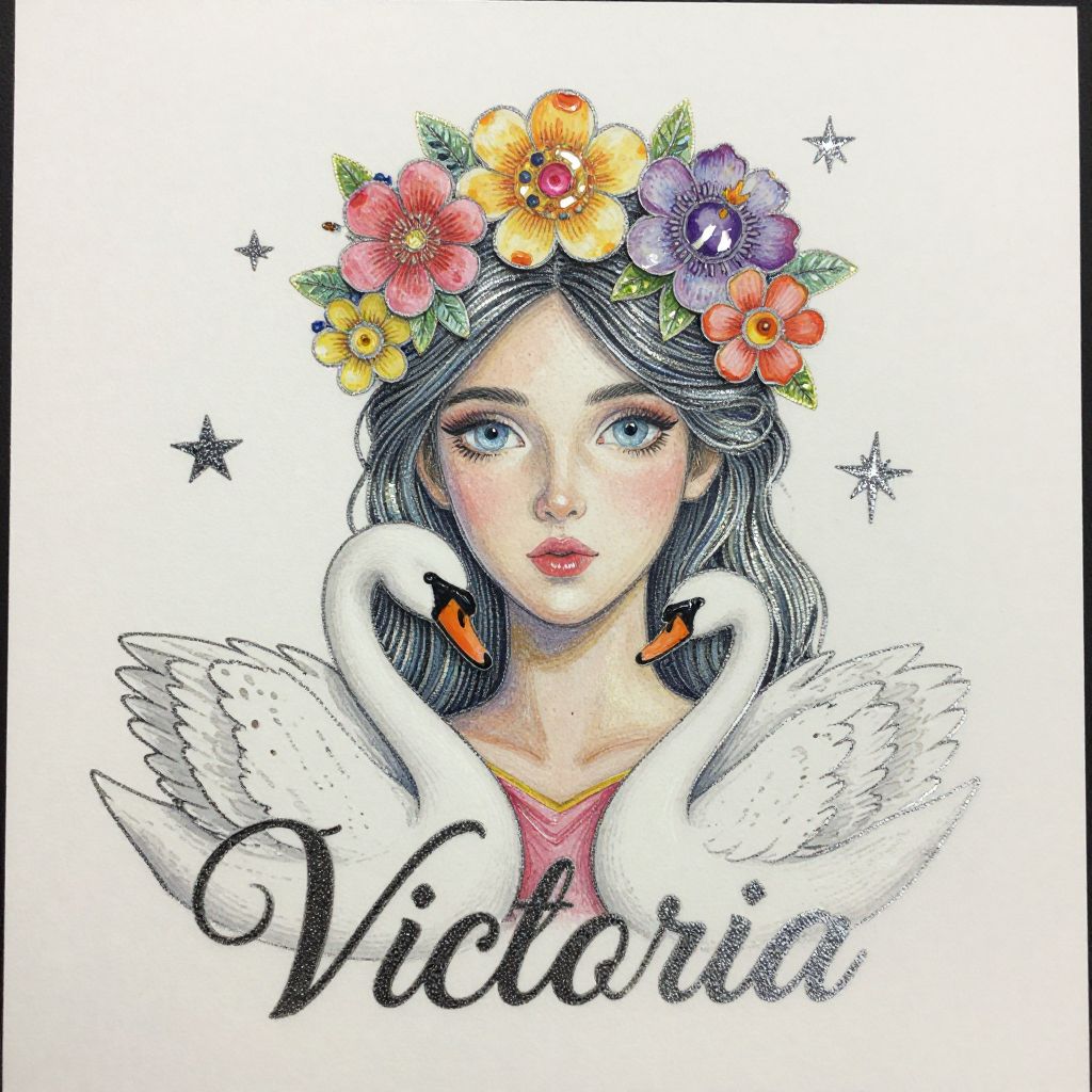 Artistic print titled 'Victoria' featuring a woman adorned with a floral head crown, surrounded by stars, and accompanied by a swan, all embellished with metallic silver ink, acrylic, glassed eyes, and vibrant details.