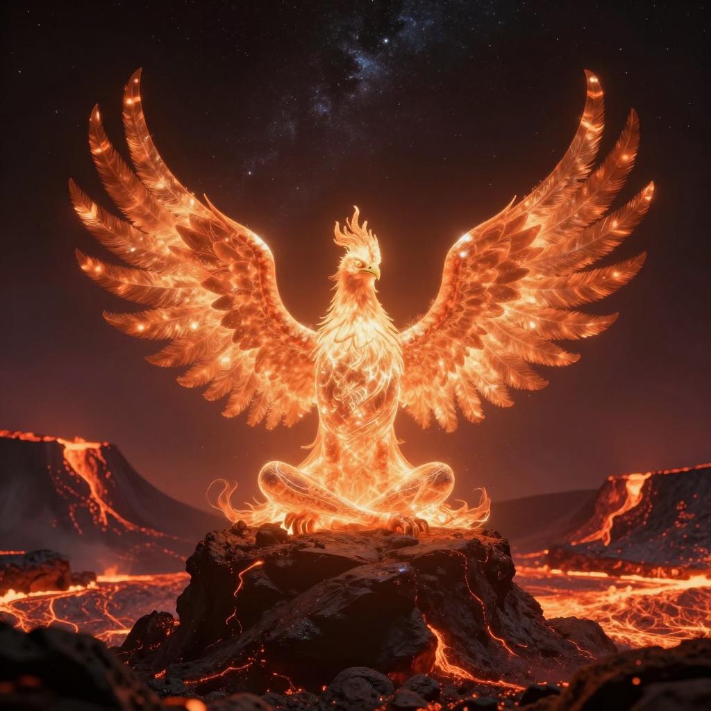 Digital artwork of a glowing phoenix in a meditative pose, perched on a rocky outcrop surrounded by molten lava. The fiery bird emits radiant light, illuminating the volcanic landscape under a star-filled night sky. The scene features vivid orange and red tones, with an ethereal and cosmic atmosphere, symbolizing calmness and introspection amidst intense natural forces.