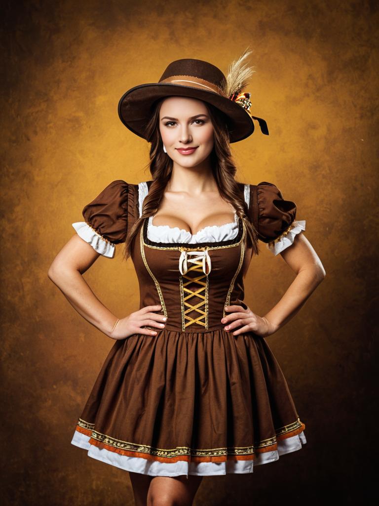Oktoberfest Costume Fancy Dress, woman in a brown dress and hat posing for a picture --sref 1391