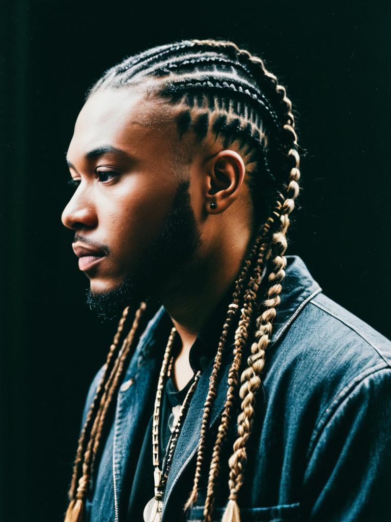 Man with Cornrow Braids, cinematic realism, editorial fashion portrait