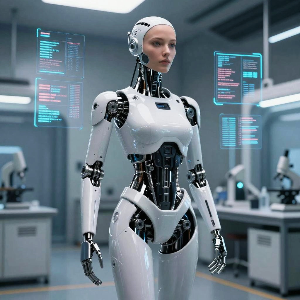 This is a CGI image of a sleek, white, female humanoid robot with a smooth, glossy exterior, standing in a modern laboratory. The robot has a slender, athletic build with pronounced curves, including a narrow waist and rounded hips. Its head is bald with a cylindrical, metallic sensor array. Blue, glowing holographic screens with code and data float to the right and left of the robot. The background features lab equipment, including microscopes on white countertops under bright, fluorescent lights, creating a sterile, high-tech environment. The robot's black joints and internal wiring contrast sharply with its white exterior.