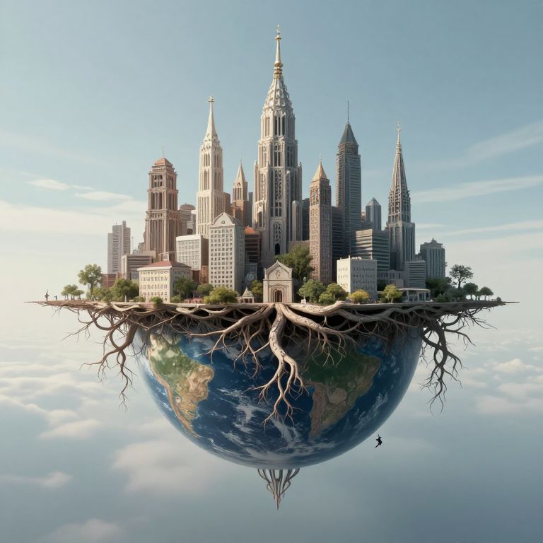 A digital illustration depicts a futuristic, floating cityscape atop a spherical Earth, with intricate tree roots extending from the bottom. The skyline features tall skyscrapers with varying architectural styles, including a prominent, spire-topped tower. The Earth below shows continents and oceans, reflecting in a calm, blue sky. A small bird is flying near the bottom right. The image combines realistic textures with a surreal concept, blending urban and natural elements in a visually striking composition.