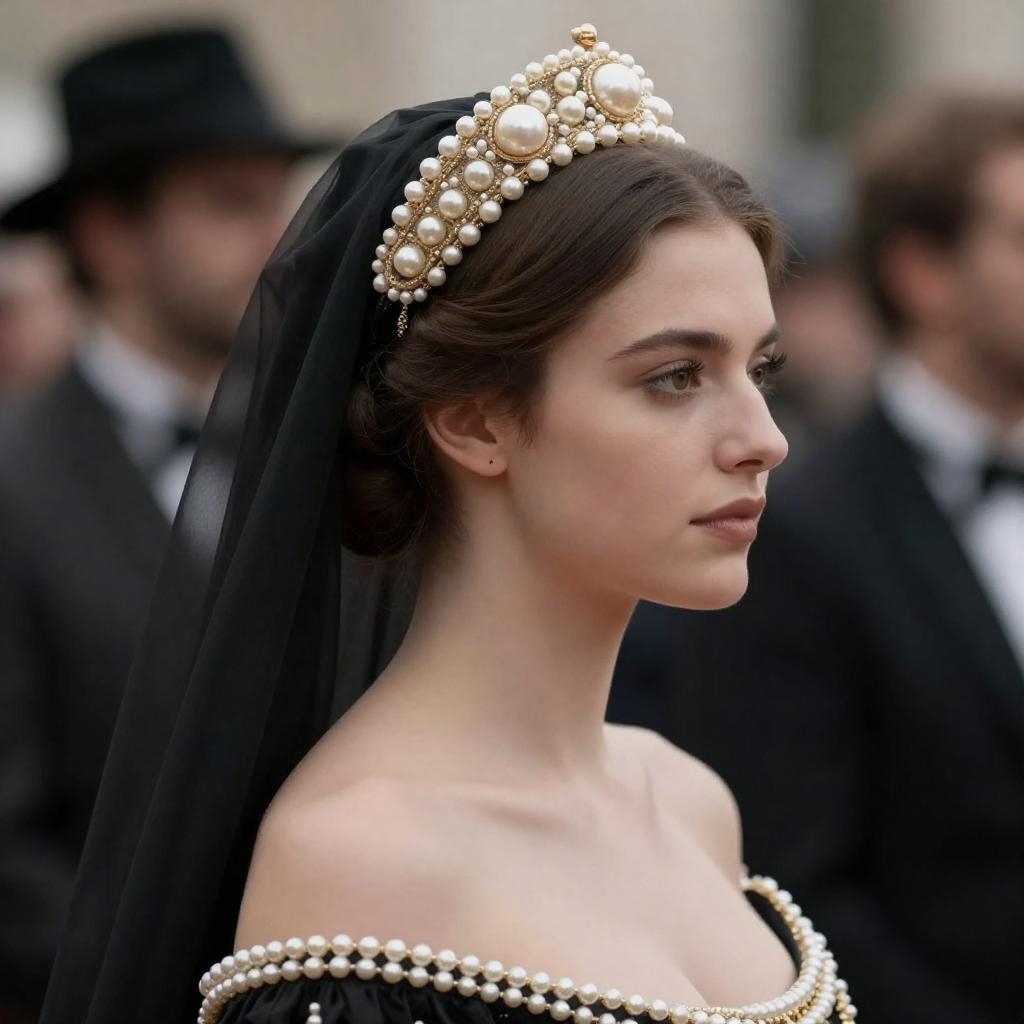 Photograph of a woman in profile, wearing a detailed, pearl-adorned headpiece with gold accents and a black veil. She has fair skin, brown hair, and is dressed in an off-the-shoulder, pearl-trimmed garment. The background is blurred, with indistinct figures in dark, muted colors.
