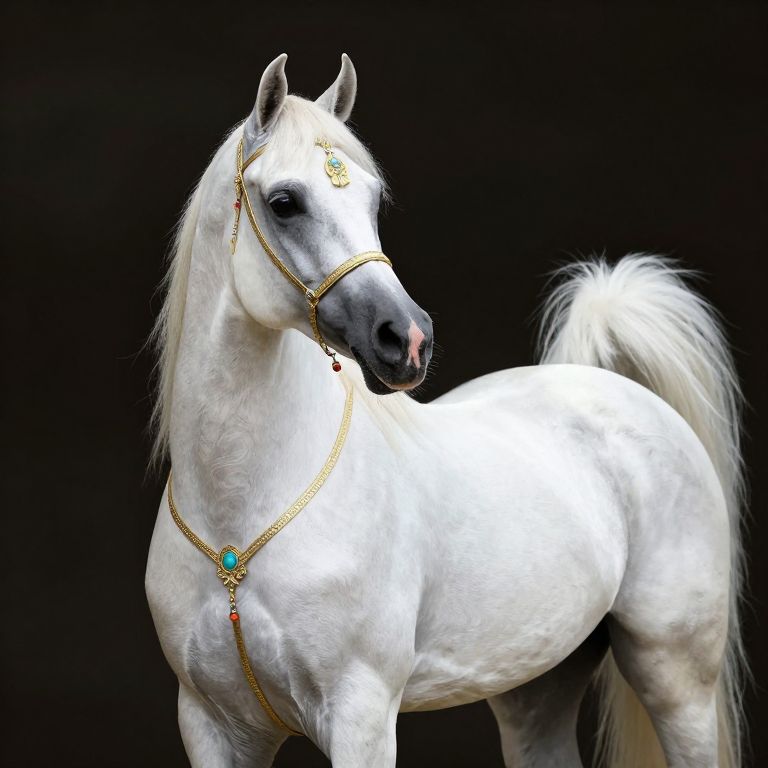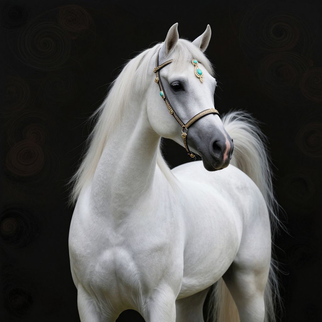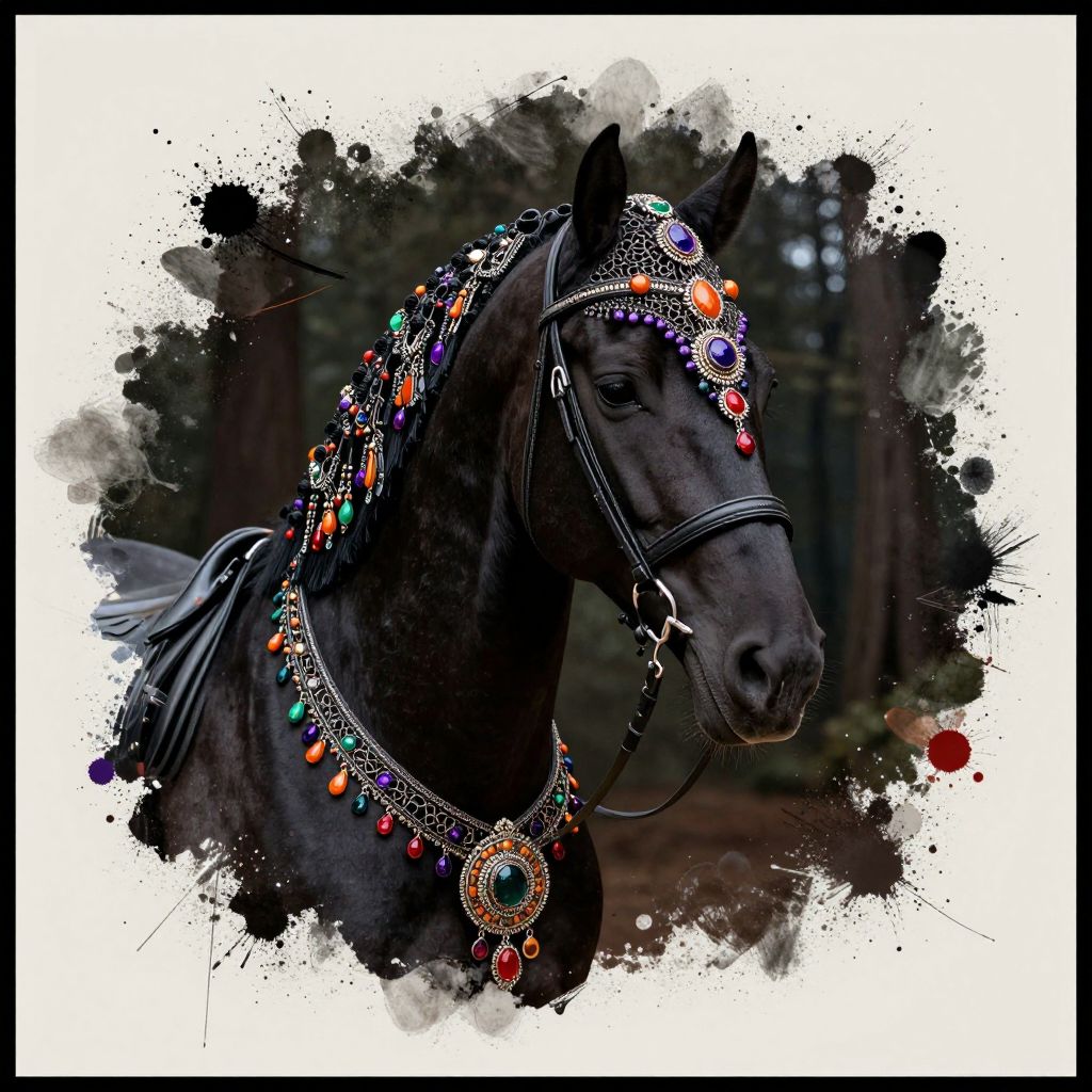 Digital illustration of a dark brown horse adorned with elaborate, colorful jewelry, including gemstones and intricate metalwork, set against a splattered black and white