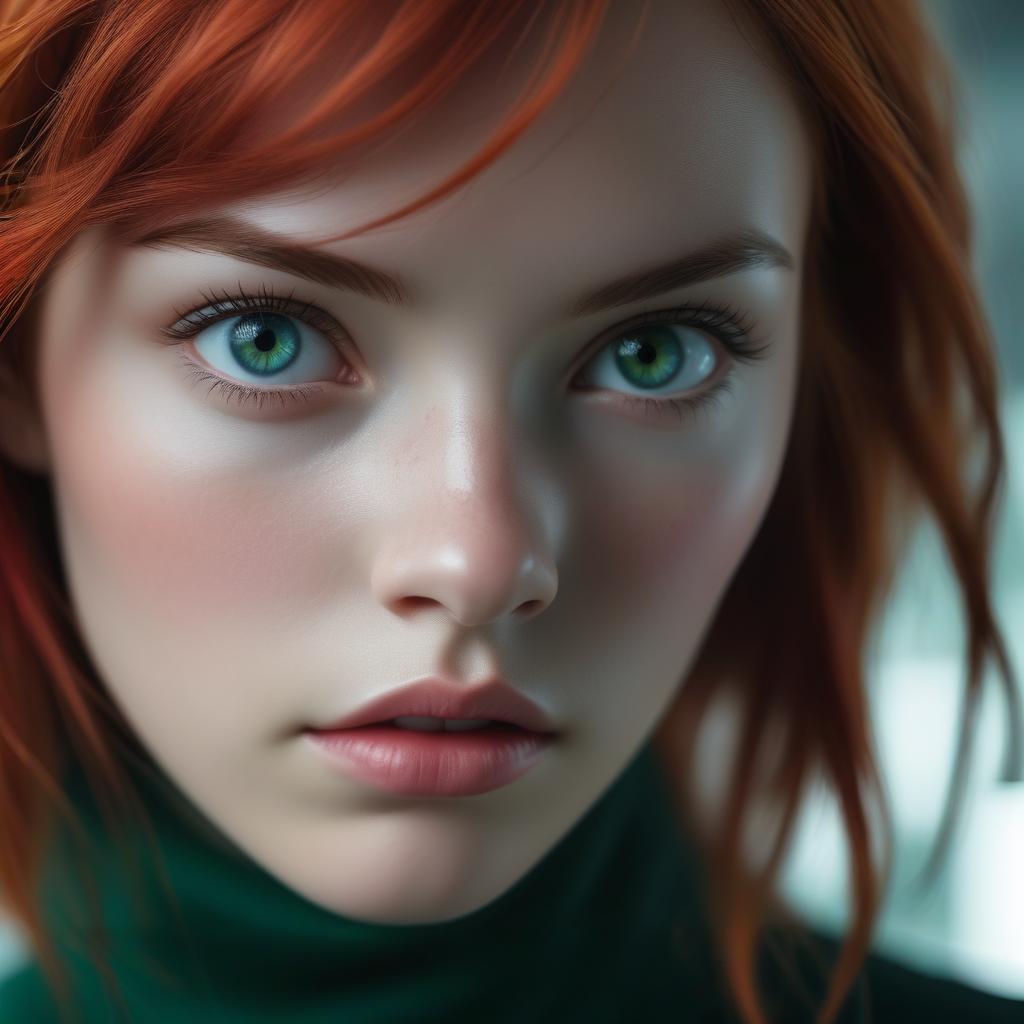 Medium close-up portrait of a female model with striking red hair and green eyes wearing an avant-garde green outfit. The image features sharp focus on the model's face with minimal background blur, emphasizing her bold makeup and vivid hair color.