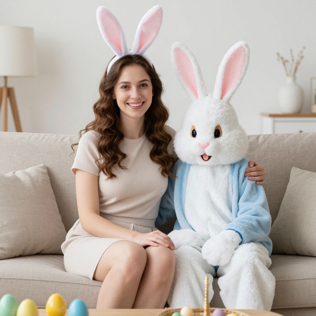 Photograph of a smiling woman with long, wavy brown hair and fair skin, wearing a short-sleeve, light beige dress, sitting on a beige sofa. She has her right arm around a person dressed in a white, furry bunny costume with pink ears and a blue jacket. The background includes a white wall, a wooden tripod lamp, and a small white table with a vase. In the foreground, there are colorful Easter eggs on a table. The woman's expression is friendly, and the bunny costume's face is cheerful. The setting is bright and modern.