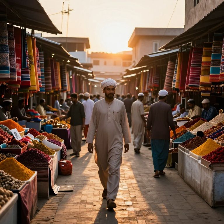 Photograph of a bustling outdoor market at sunset. A bearded man in a white traditional Pakistani outfit and cap walks down the center aisle, illuminated by the golden sunlight. Surrounding him are colorful stalls displaying vibrant spices, textiles, and goods. Other men in traditional attire, some with caps, navigate the crowded path. The market's overhead canopy and surrounding buildings create a narrow, vibrant corridor. The sun casts long shadows, enhancing the warm, lively atmosphere. The textures of the stone pathway and hanging textiles add depth to the scene.