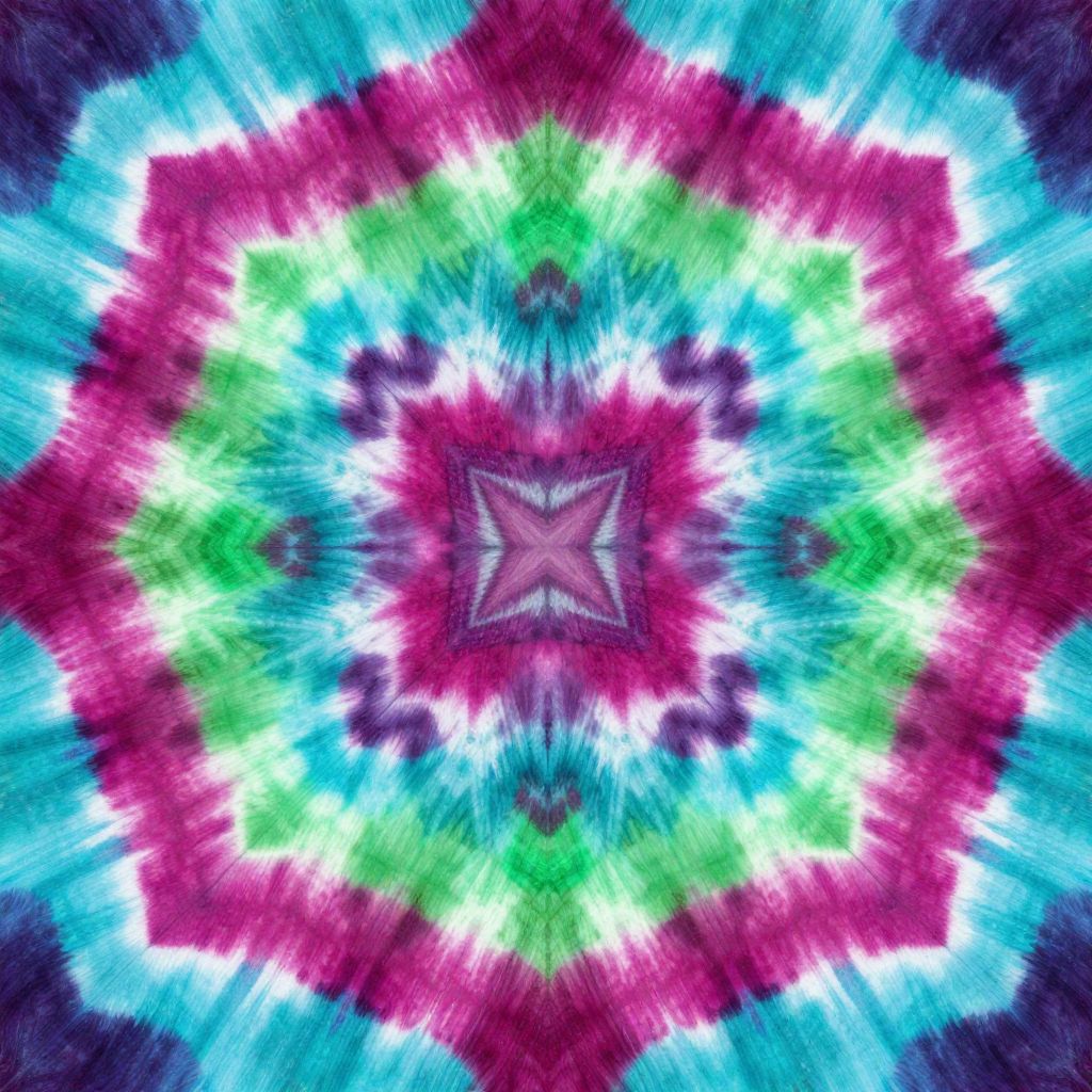 Tie dye generator illustrating layered geometric patterns with vibrant color layering, symmetrical kaleidoscopic design in bold magentas, greens, and turquoises, close-up photorealistic view of fabric with visible weave, radiant dye blending effect