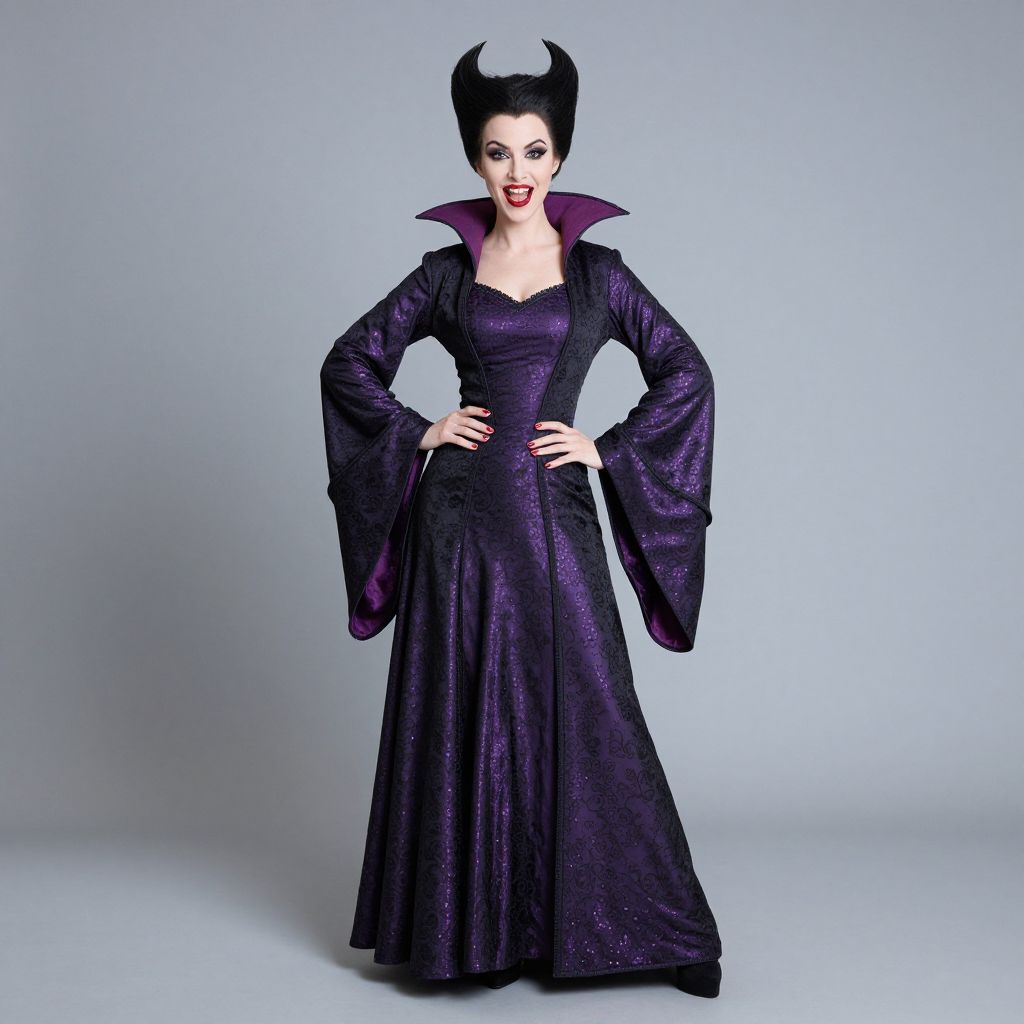 Photograph of a pale-skinned woman with black, stylized, horned hair wearing a dark purple, full-length, Gothic-style gown with wide, flowing sleeves. The dress has a high, maroon-colored collar and a fitted bodice with a sweetheart neckline. She stands confidently with hands on hips against a plain, light gray background. Her makeup is dramatic, featuring bold red lipstick and dark eyeliner. The texture of the dress is slightly shimmering, adding to its elegant yet ominous look. Her expression is serious and commanding.