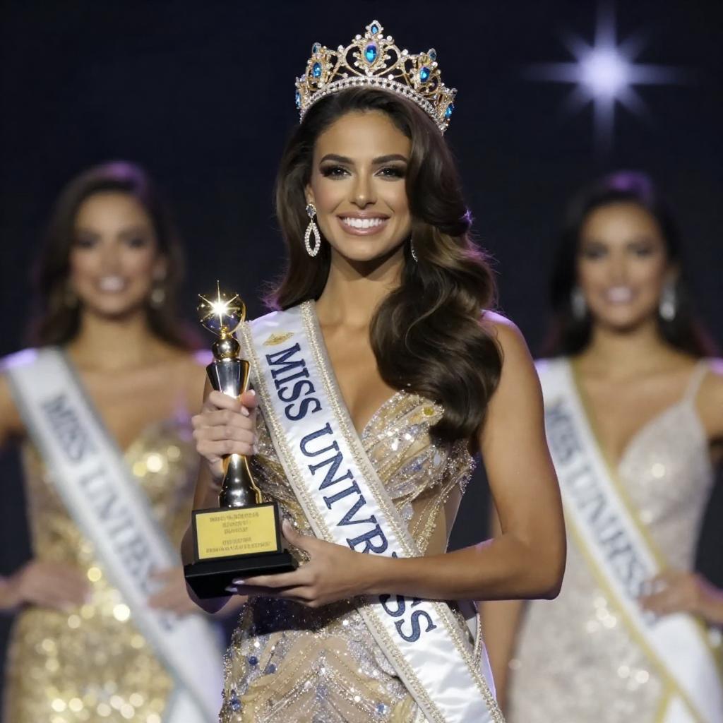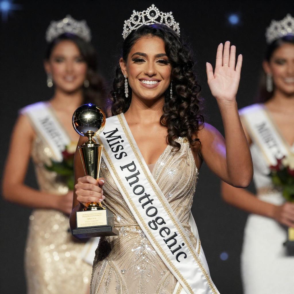 Photograph of a smiling woman with dark curly hair, wearing a white sash with "Miss Photogenic" and a gold dress, holding a trophy with sparkling elements. She raises her right hand. Background includes other women in dresses, one in gold and one in white, with dark, star-patterned backdrop.