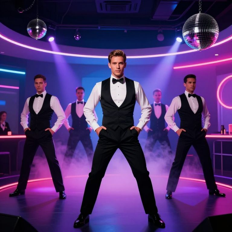 Photograph of a nightclub scene featuring a group of five male dancers in black vests, white shirts, and black bow ties. The central dancer, with hands in pockets and legs apart, stands confidently in front of a backdrop of pink and blue neon lights, surrounded by mist. Two dancers stand to either side, while two more are slightly blurred in the background. Two silver disco balls hang from the ceiling. The floor is dark, and the overall atmosphere is vibrant and energetic.