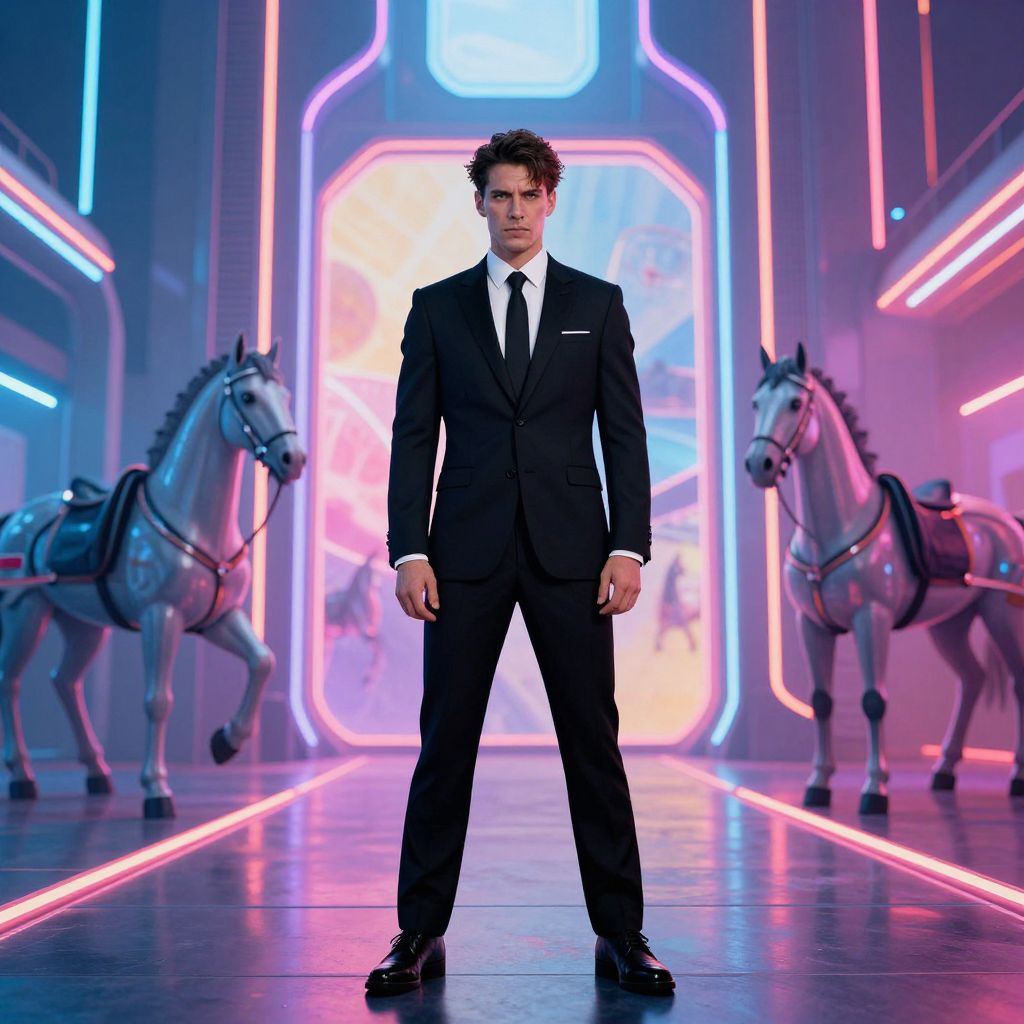 Chippendales inspired male entertainers in tuxedo vests and bow ties, striking confident poses on a neon-lit stage, sleek modern interior with disco balls, vivid lighting and smoky effects, celebrating performance art and nightlife culture, photorealistic style.
