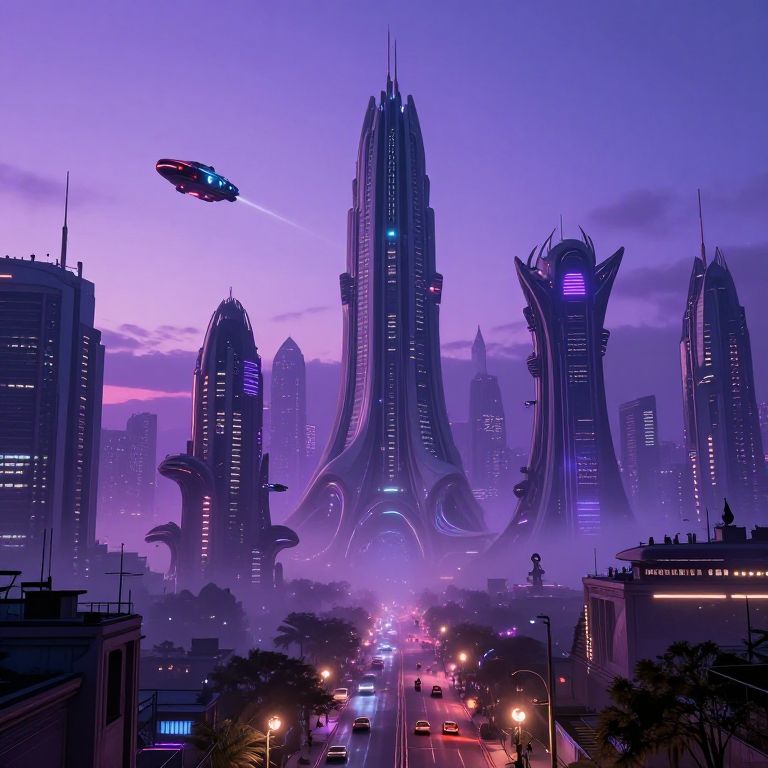 Alien planet city at dusk, towering futuristic skyscrapers glowing with neon lights, bizarre organic architecture blending with advanced technology, flying vehicles zooming through the sky, mysterious alien inhabitants walking the vibrant streets, foggy purple atmosphere