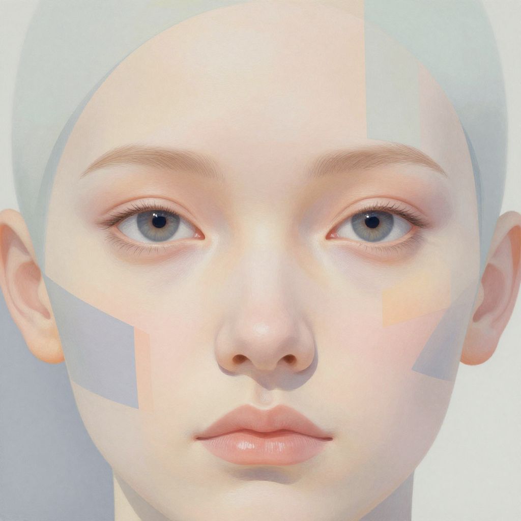 This is a digital CGI image of a young, fair-skinned person with a smooth, bald head and blue eyes. The person's face is symmetrical with light pink lips and minimal facial hair. Two translucent, light blue rectangular patches are visible on the left cheek and lower right cheek. The background is a gradient of soft blue and white, adding a modern, minimalistic feel. The lighting is even, emphasizing the person's smooth skin texture and youthful appearance. The image has a clean, almost ethereal quality, focusing on the simplicity and purity of the subject's features.