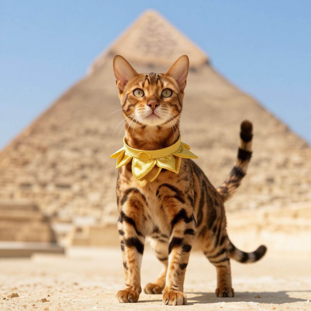 Photograph of a Bengal cat with yellow bandana, standing in front of a pyramidal structure in a sandy desert. Blue sky above. Cat