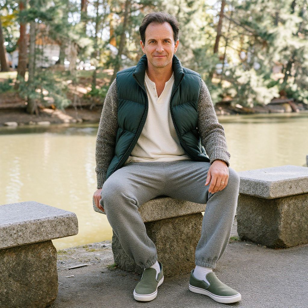 A man, forest green puffer vest, slate gray sweatpants, cream henley shirt, olive green slip-on sneakers, textured knit cardigan, rustic stone benches beside warm waters, oversaturated film, relaxed smile, soft sunlight filtering through tall pines. Man has masculine face and piercing eyes