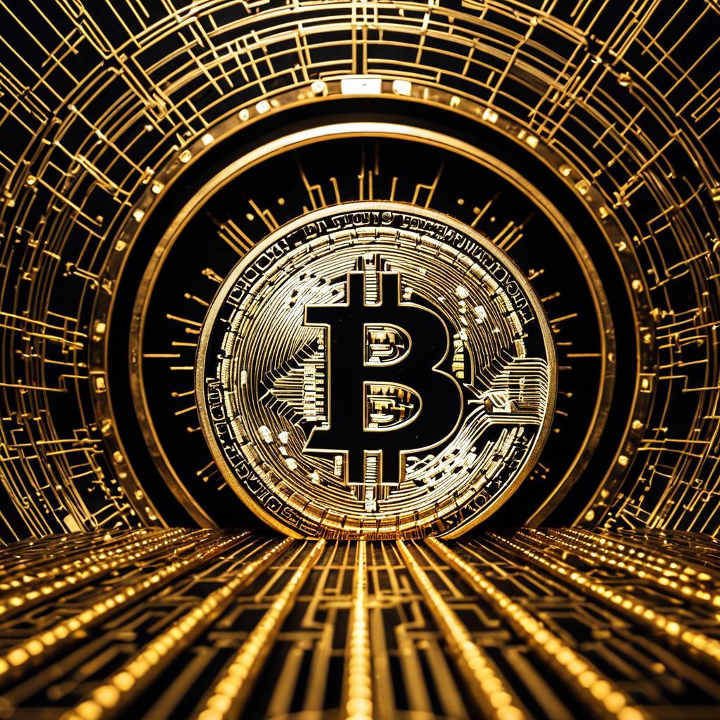 Close-up view of a golden bitcoin logo integrated with digital circuit patterns, representing cryptocurrency and blockchain technology. The high-tech design conveys innovation in decentralized networks and digital finance.