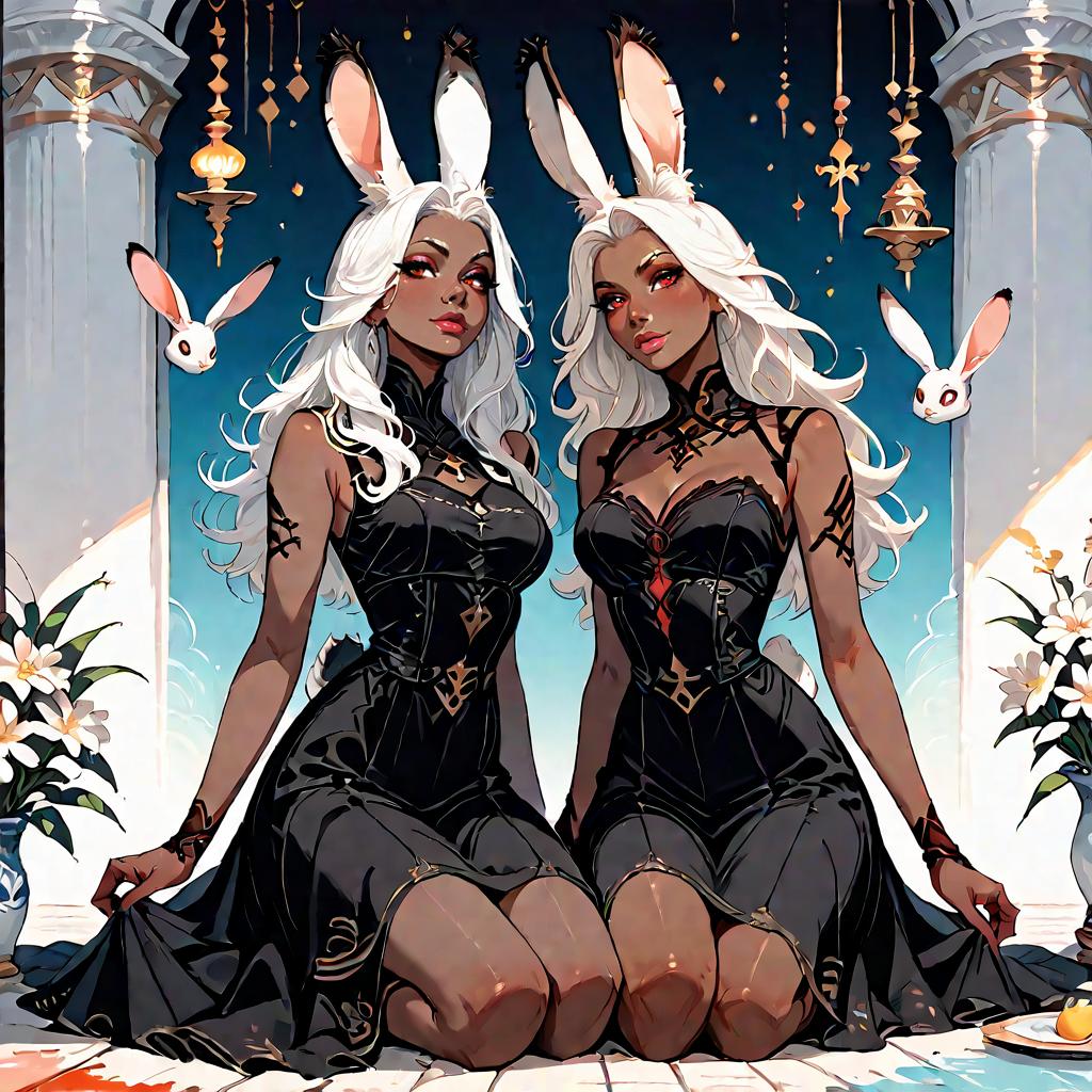 Digital fantasy artwork featuring two dark-skinned female characters with long white hair and rabbit ears, dressed in elegant black dresses with red trim. Both are kneeling side-by-side in a richly decorated setting with columns and hanging golden ornaments, surrounded by white lilies and small floating rabbit companions.