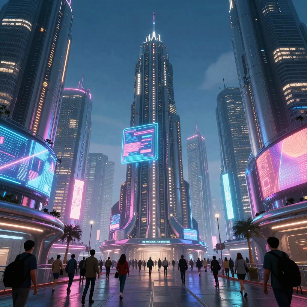 Myphs, futuristic cityscape with towering spires and holographic displays, neon lights reflecting off sleek metallic surfaces, bustling streets with diverse inhabitants, cyberpunk aesthetics, vibrant colors and dynamic composition.