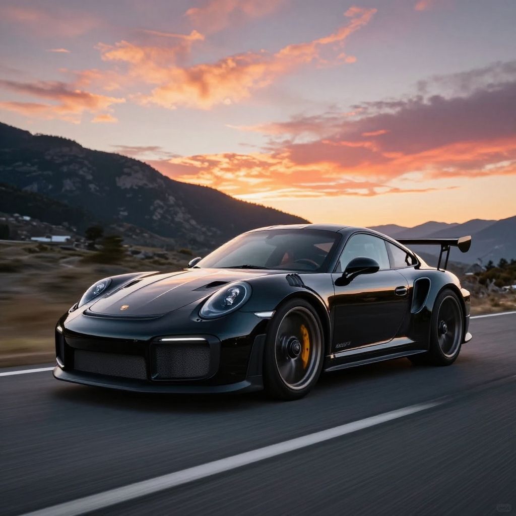 Black Porsche 911 GT2 RS speeding through rainy city streets at night, wet asphalt reflections, neon lights glowing, aggressive stance, photorealistic urban atmosphere