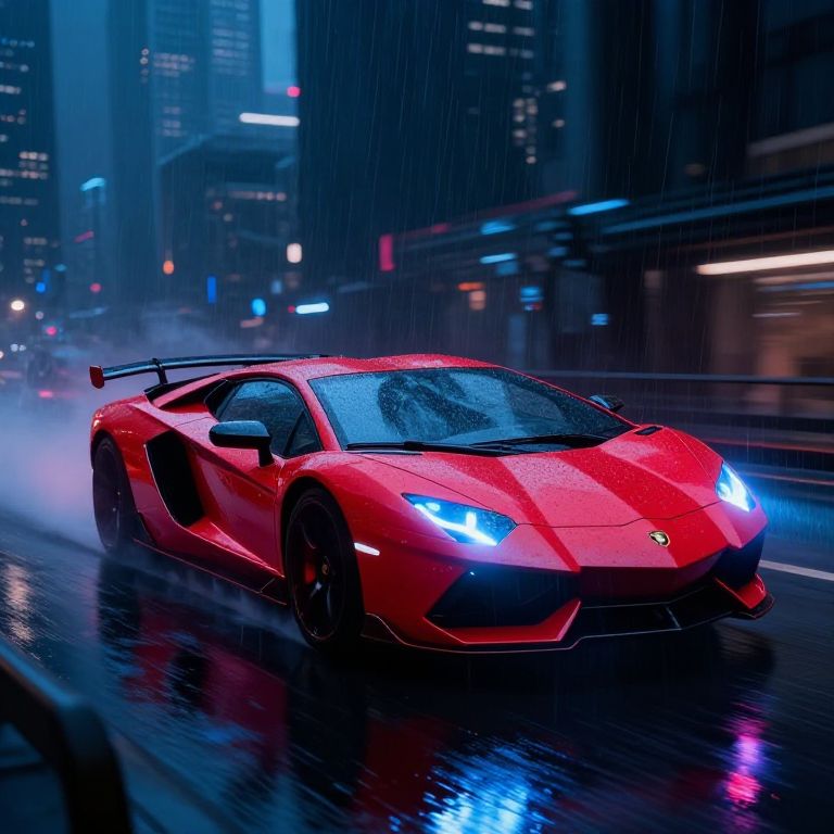 Photograph of a sleek, black, high-performance sports car with a prominent rear spoiler, parked on a wet, reflective street at night. The car's headlights are on, casting bright white beams on the glossy pavement. The background features blurred, illuminated storefronts and buildings with a mix of blue and white lights, adding to the urban night scene. The car's gold alloy wheels and the wet street surface create vivid reflections. The image has a dynamic, slightly motion-blurred effect, emphasizing the car's presence and the wet conditions.
