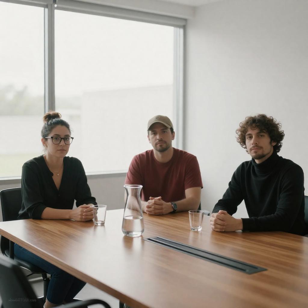 Photograph of three people seated at a wooden conference table in a modern office with large windows. A woman with dark hair in a bun, wearing glasses and a black top, sits on the left. A man in a red shirt and baseball cap sits in the center. A man with curly hair and a black turtleneck sits on the right. All have neutral expressions. Clear glass pitcher and glasses on the table. Black chairs around the table. Bright daylight from windows in the background. "moviestill09.com" in the bottom left corner.