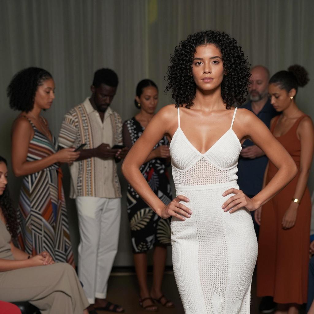 A woman with curly black hair in a white, low-cut, spaghetti strap dress with cutout patterns, standing with hands on hips, looking forward. Background: six people, varied outfits, patterned and solid colors, standing and seated, focused on different activities. Dimly lit room with green curtains.