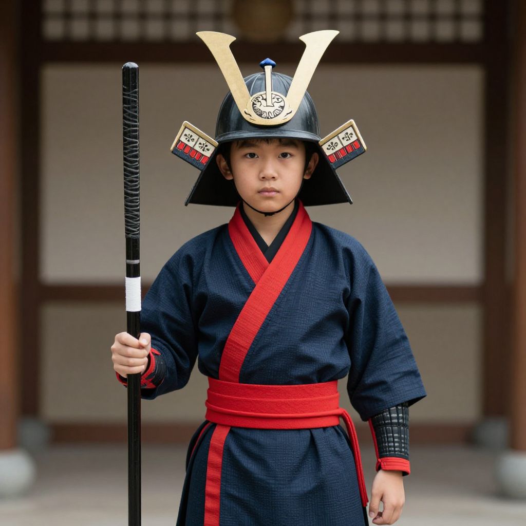 Photograph of a young Asian boy in traditional Japanese samurai attire, wearing a black helmet with white horns, holding a black spear, standing in a