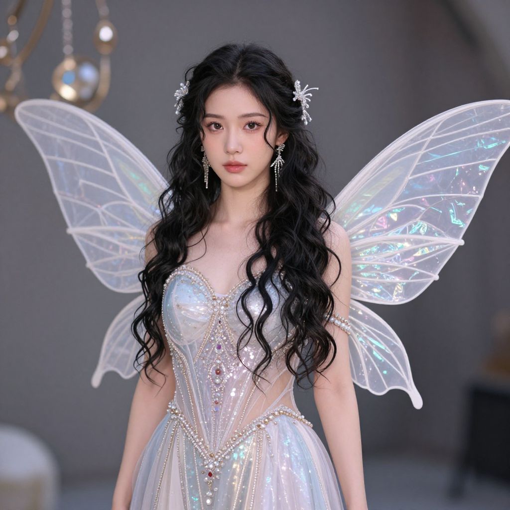 Digital CGI fantasy portrait of an Asian woman with long black wavy hair, wearing a sparkling white dress and translucent, iridescent fairy wings, against
