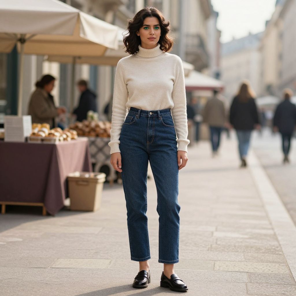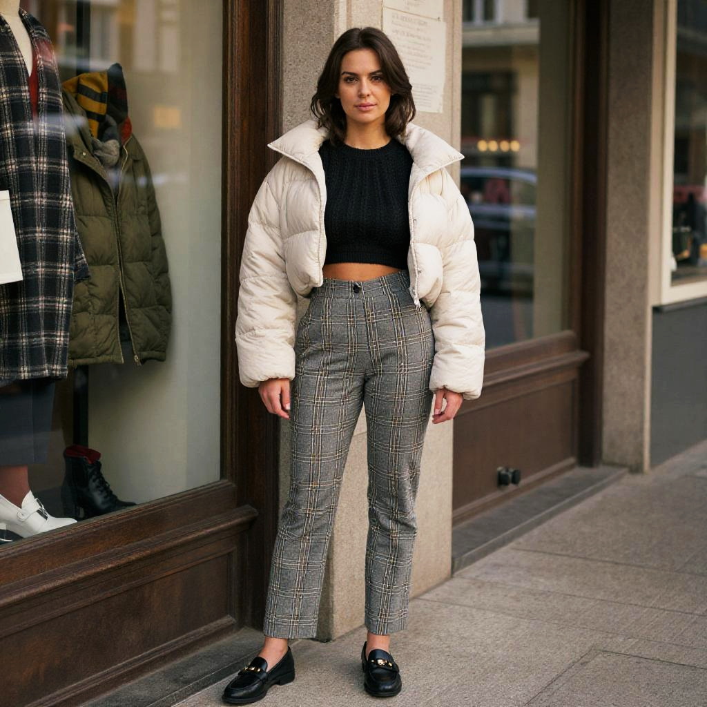 A woman in a cropped cream puffer jacket and high-waisted plaid trousers stands in a vintage boutique near an old theater, embodying a casual contemporary style. The look is completed with a black textured crop top and black loafers featuring a buckle detail, all captured in a lithographic film visual style. Sexy. Pretty face and beаutiful eyes. Big breasts