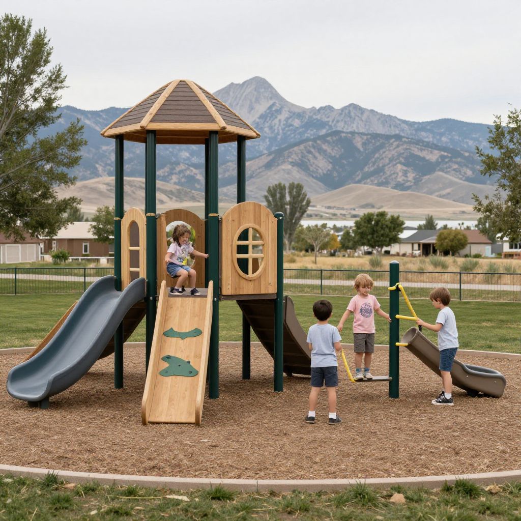 Photograph of five children playing on a wooden playground structure with slides, set in a grassy park with mountains in the background.